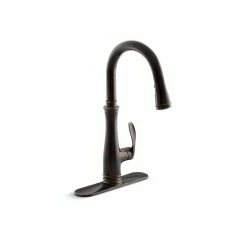 With its sleek look and innovative features, this Bellera pull-down kitchen faucet combines an elegant, versatile design with exceptional ergonomics and functionality. The high-arch spout rotates 360 degrees and reaches over the tallest pots, while the compact, three-function sprayhead pulls down into the sink for up-close tasks, or out of the sink to fill pots. Sweep spray creates a wide, forceful blade of water for superior cleaning. Kohler’s new docking system, DockNetik, secures the pull-down sprayhead to the spout using magnetic force.