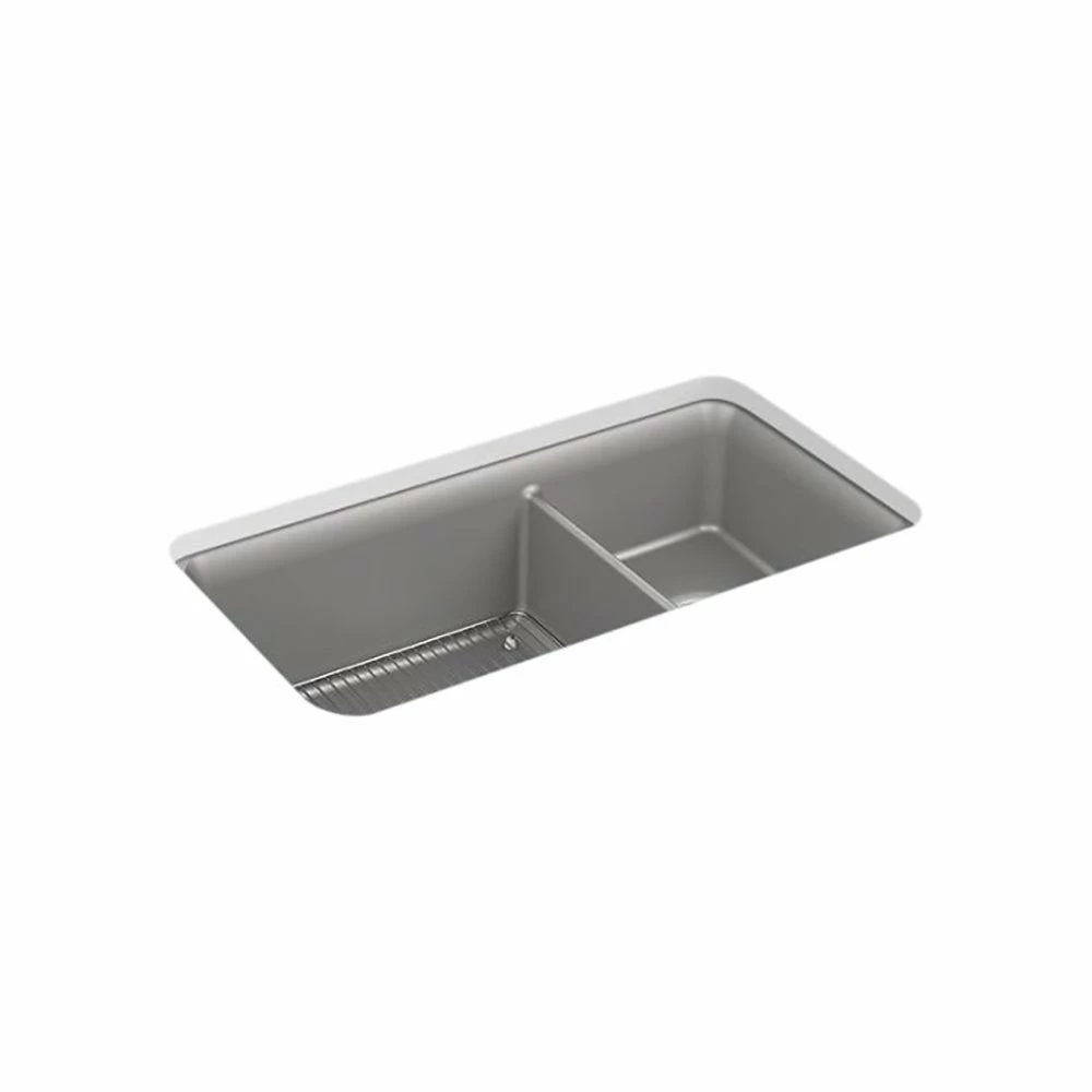 With soft French curves, the Cairn sink offers transitional style to suit contemporary and traditional kitchens alike. The Cairn sink is made of KOHLER Neoroc(R), a matte-finish composite material designed for extreme durability and unmatched beauty. Richly colored to complement any countertop, Neoroc resists scratches, stains, and fading and is highly heat- and impact-resistant. This sink includes a rack for the large basin to keep the surface looking new.