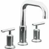 - Two-handle widespread sink faucet for 8″ – 16″ centers features unique recessed valve installation