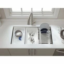 Create a highly functional kitchen workstation with the Prolific sink and its included accessories. This innovative stainless-steel sink features three graduated ledges in the basin, so you can place the bamboo cutting board, multipurpose grated racks (two), colander, and washbin exactly where you want them for maximum efficiency as you work. The sink comes with all five accessories included. Other features include a unique cone-shaped drain for easier cleanup and SilentShield(R) sound absorption for less noise.