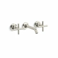 Capturing the style of minimalist design, Purist faucets deliver streamlined water control. This sink faucet trim features a 35-degree angled spout and cross handles for easy operation. The convenient wall-mount design provides a clutter-free countertop in your bath or powder room. When paired with a two-handle ceramic disc valve, this trim offers optimal performance. Combine it with bath accessories from the Purist collection for a distinctively modern and unified decor.