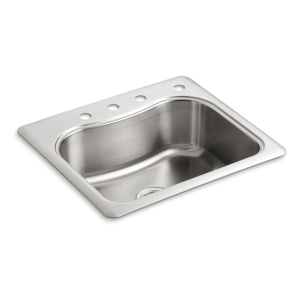 The unique curved, mirrored rim of the Staccato single-bowl sink adds a fresh and elegant look to the kitchen. Crafted of sleek and durable stainless steel, Staccato is a high-performance sink with an engineered sound-absorption system that significantly reduces disposal and dishwashing noise. This version includes a right-hand hole, which makes it easy to add a soap or lotion dispenser.