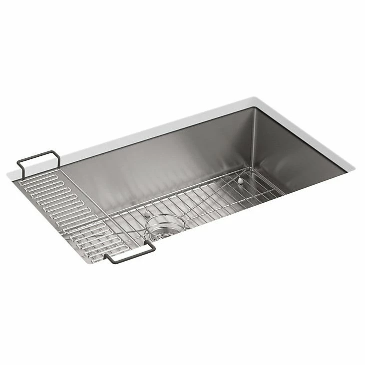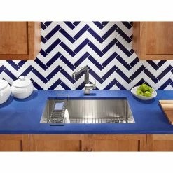 This Strive kitchen sink offers professional style with easy-to-clean curved corners. Made of thick, premium quality 16-gauge stainless steel, the large, deep single bowl allows you to soak and clean large cookware and bakeware. Strive features a sound-absorption system that significantly reduces disposal and dishwashing noise. This sink includes a bottom sink rack to help prevent scratches and a sink bridge utility shelf with dishcloth bar to organize dishcloths, scrubbers, and sponges.