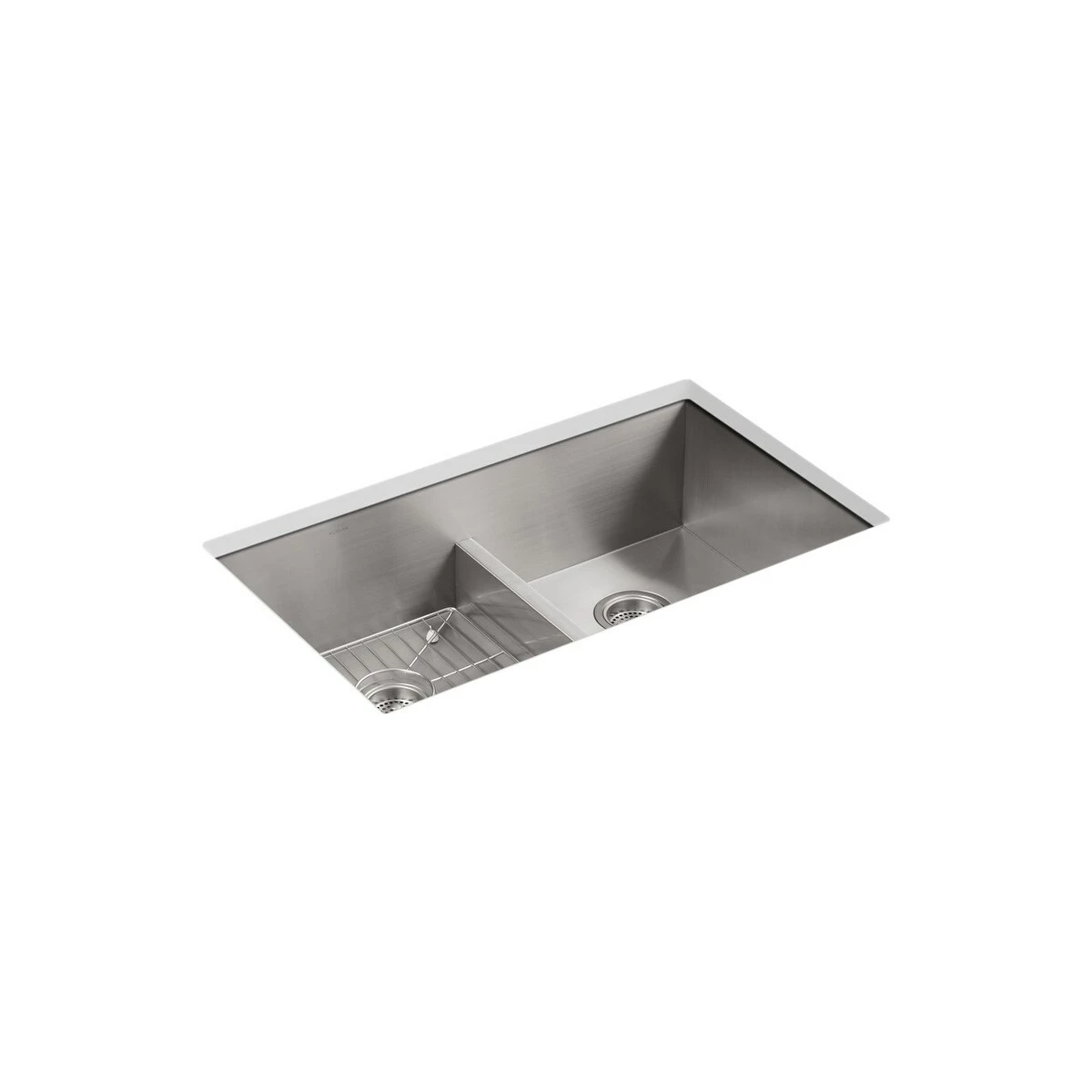 The distinctive, modern design of the Vault dual-mount sink lends a contemporary vibe to your kitchen. Handcrafted from stainless steel, this sink features tightly angled corners to maximize basin space and lowered divider for freedom of movement between basins. When installed as a top-mount sink, Vault offers a low-profile rim that makes it easier to wipe from the countertop directly into the bowl. An included bottom sink rack fits in either bowl and helps prevent scratches.